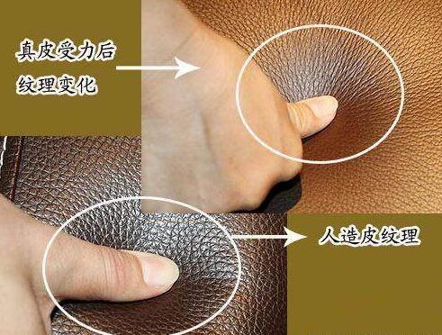 用手觸摸面料表面,天然皮革的手感滑爽、柔軟、豐滿有彈性,將其正面向下彎折90度左右會(huì)出現(xiàn)自然皺褶,分別彎折不同部位,產(chǎn)生的折紋粗細(xì)多少有明顯的不均勻,紋路也不均勻,放手后褶皺會(huì)回彈恢復(fù)到原來的形狀。而人造皮革屬于人工合成產(chǎn)品,手感發(fā)澀、柔韌性、彈性差,彎折不同部分產(chǎn)生的折紋粗細(xì)多少都相似,紋路清晰均勻。