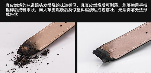 從天然革和人造革背面撕下一點(diǎn)纖維,點(diǎn)燃后,凡發(fā)出刺鼻的氣味,結(jié)成疙瘩的是人造革;凡是發(fā)出毛發(fā)氣味,燃燒物不結(jié)硬疙瘩、一捏就成粉末的是天然皮革。
